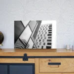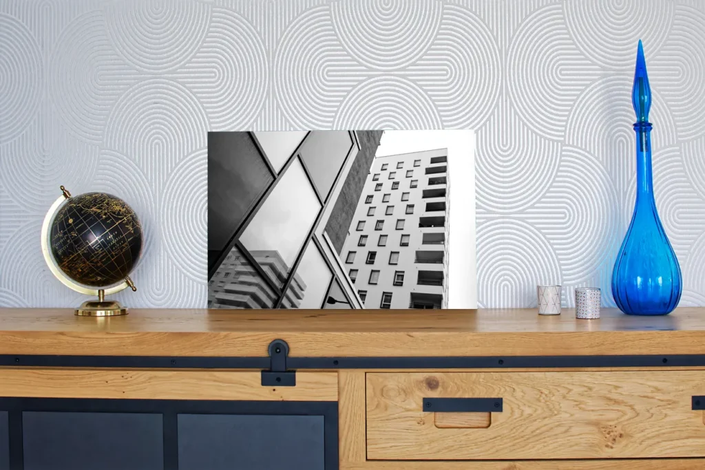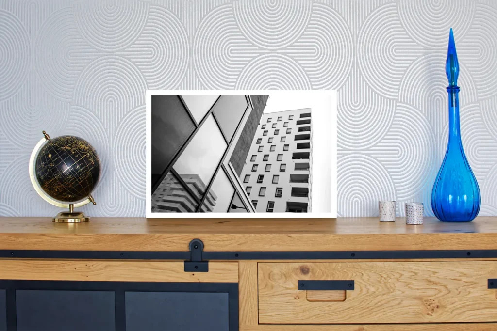 Un profil de suspension (ou châssis rentrant) en aluminium est proposé avec les tirages sur alu-dibond. Il donnera l’impression que la photo « flotte » sur le mur, ce profil fait entre 1,7 et 2 cm d’épaisseur (selon format du tirage). Il est positionné à l’arrière, à 10 cm des bords.