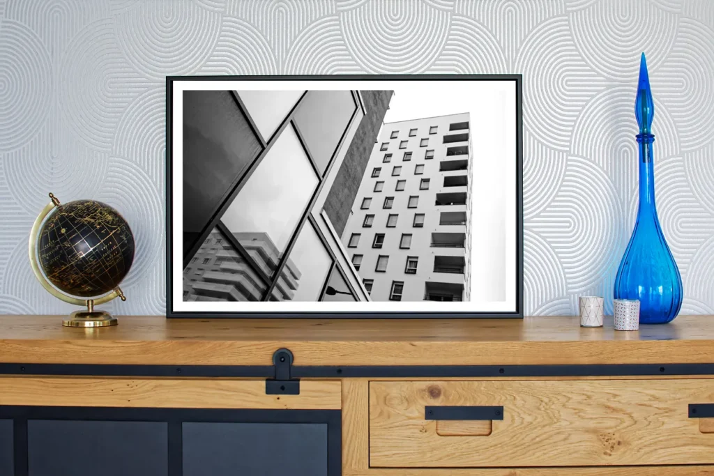 Je vous propose de sublimer le tirage avec un encadrement noir (en aluminium) de haute qualité, la caisse américaine. Un espace sépare le tirage du cadre pour un effet « flottant ». Cet encadrement vient ajouter environ 5 cm en largeur et 5 cm en hauteur au format total du tirage.