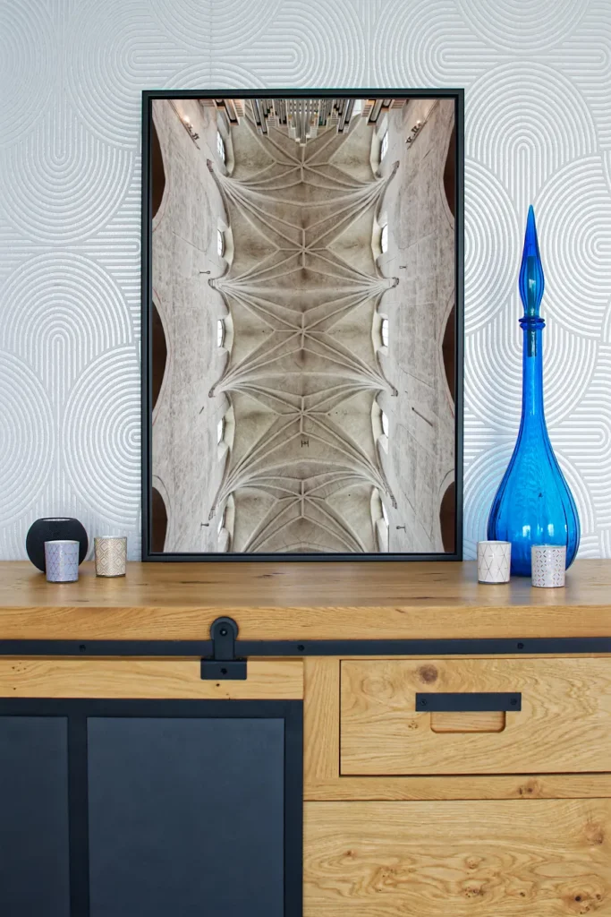 Un profil de suspension (ou châssis rentrant) en aluminium est proposé avec les tirages sur alu-dibond. Il donnera l’impression que la photo « flotte » sur le mur, ce profil fait entre 1,7 et 2 cm d’épaisseur (selon format du tirage). Il est positionné à l’arrière, à 10 cm des bords.