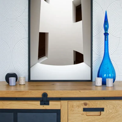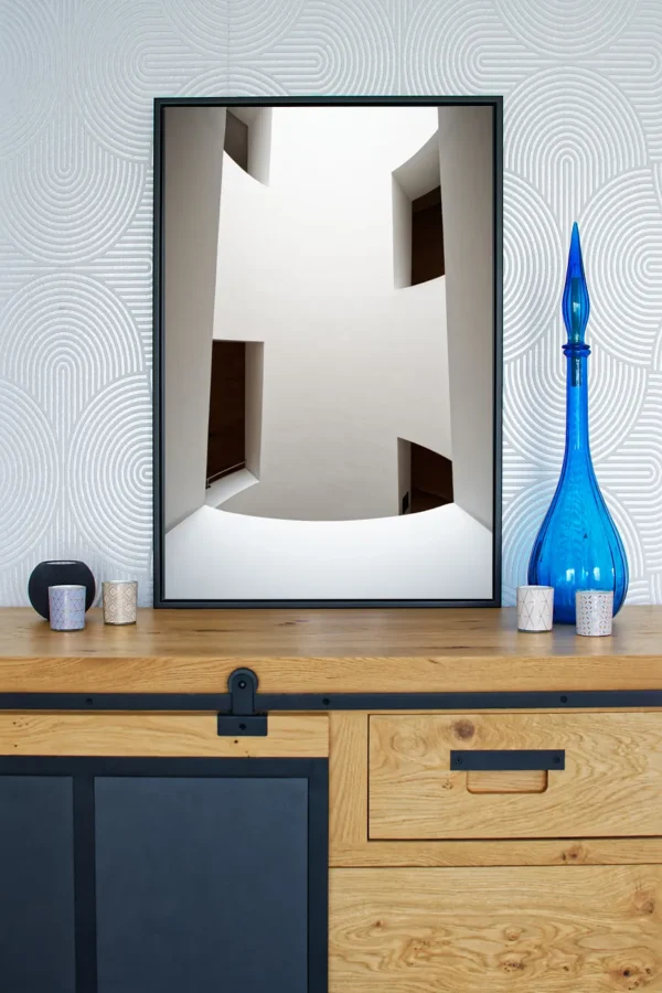 Un profil de suspension (ou châssis rentrant) en aluminium est proposé avec les tirages sur alu-dibond. Il donnera l’impression que la photo « flotte » sur le mur, ce profil fait entre 1,7 et 2 cm d’épaisseur (selon format du tirage). Il est positionné à l’arrière, à 10 cm des bords.