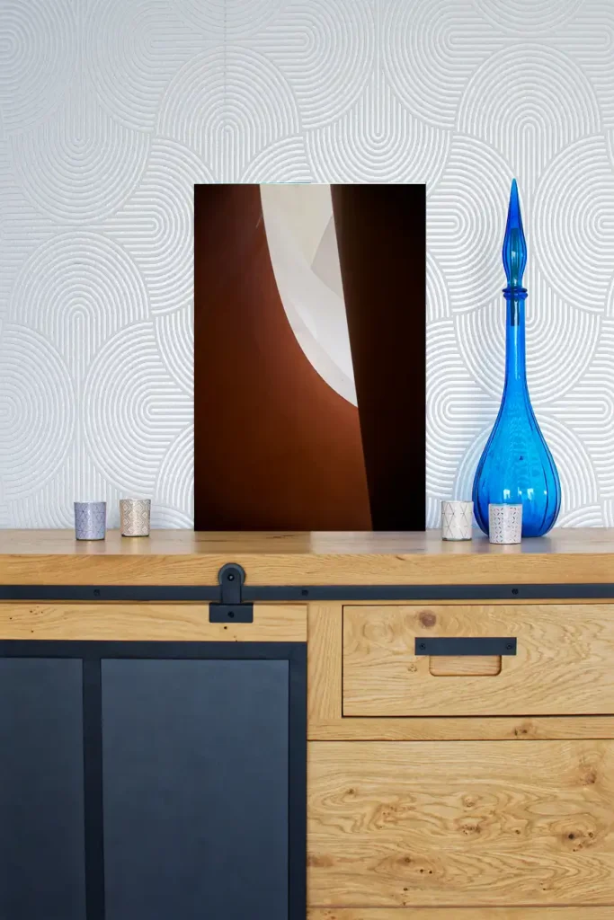 Un profil de suspension (ou châssis rentrant) en aluminium est proposé avec les tirages sur alu-dibond. Il donnera l’impression que la photo « flotte » sur le mur, ce profil fait entre 1,7 et 2 cm d’épaisseur (selon format du tirage). Il est positionné à l’arrière, à 10 cm des bords.
